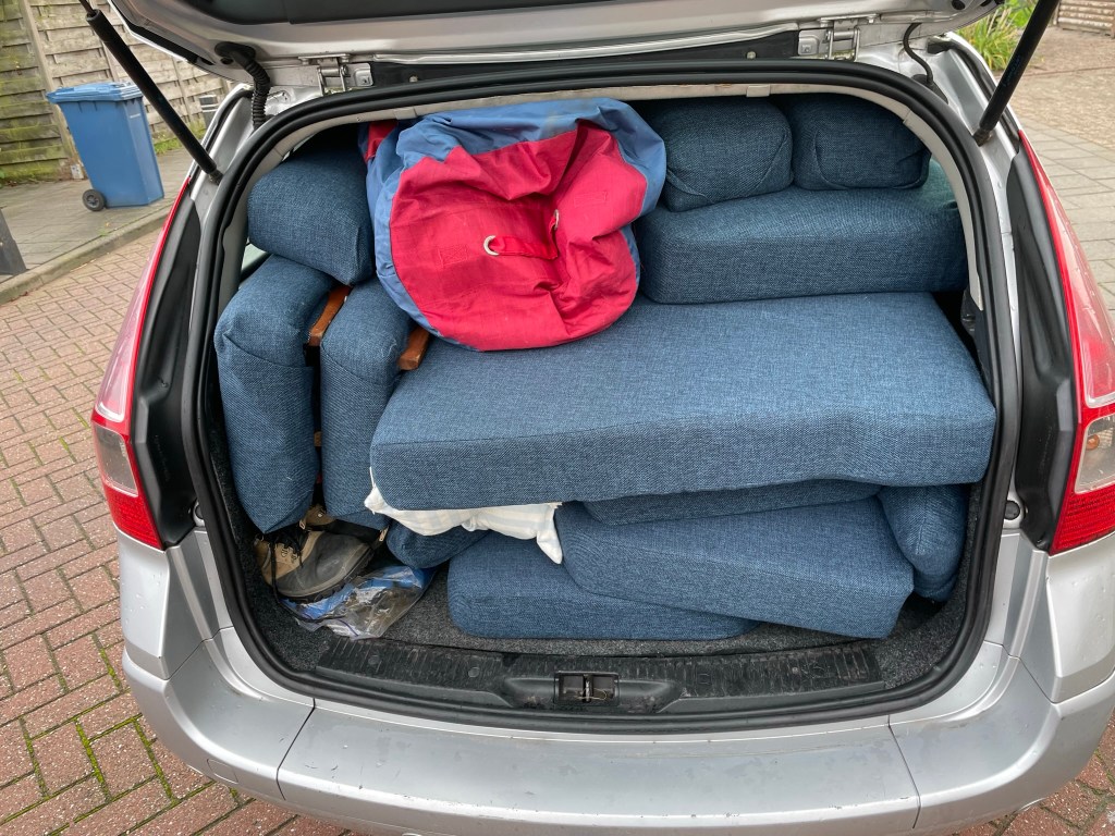 Ook de kussens haal ik maar vast vanboord. Aangezien dit in het water iets makkelijker gaat dan op de kant. Ze passen net allemaal in de auto. Daarna moeten ze nog naar zolder. Ook dat lukt in m`n eentje met als voordeel dat ik deze week niet meer naar de sportschool hoef.