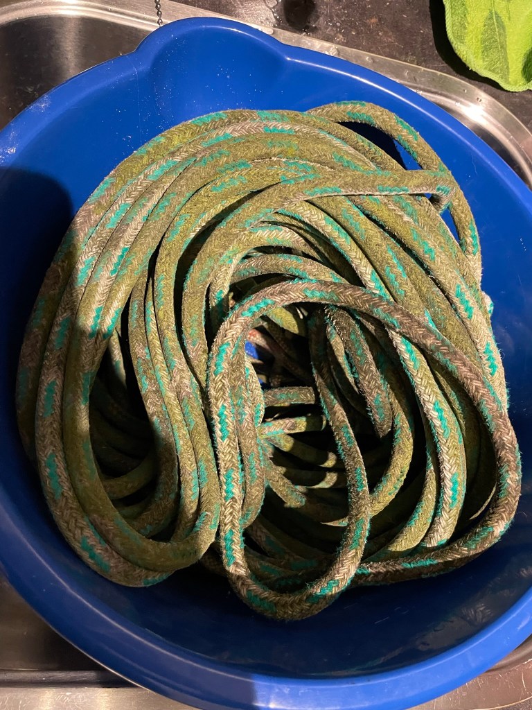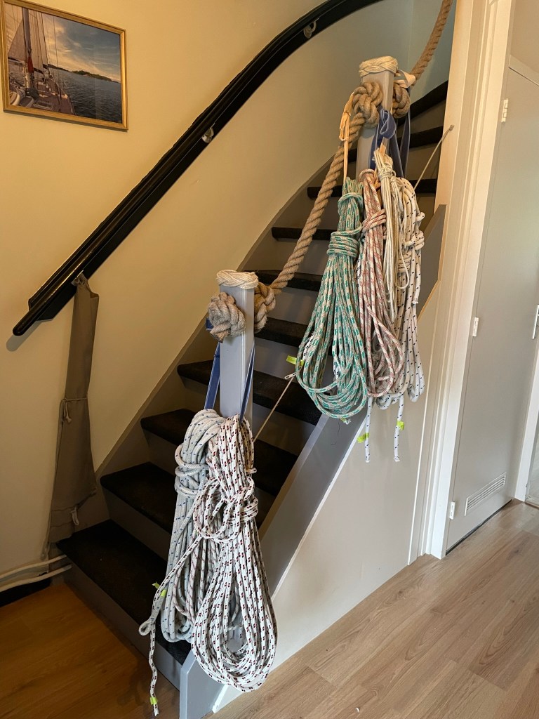 Dan haal ik alvast zoveel mogelijk lijnen uit de mast. Aangezien die nog steeds erg groen zijn ondergaan die eerst een wasbeurt. Eerst een nachtje in de biotext en dan een rondje in de wasmachine. Hierna mogen ze op zolder overwinteren. Al denk ik dat ze daar blijven en uiteindelijk vervangen worden. Maar we zullen zien of het budget dat nog toestaat.