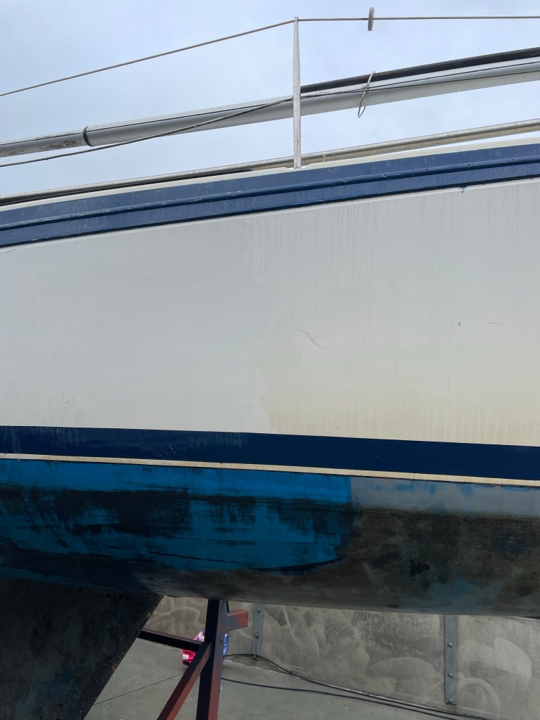 Na de thee jeuken mijn handen en ga ik ondanks de regen opkomst aan de slag. Aangezien ik nog op de afspuitplaats sta haal ik eerst maar even de gele aanslag van de romp. Dat ziet er weer een stuk beter uit.