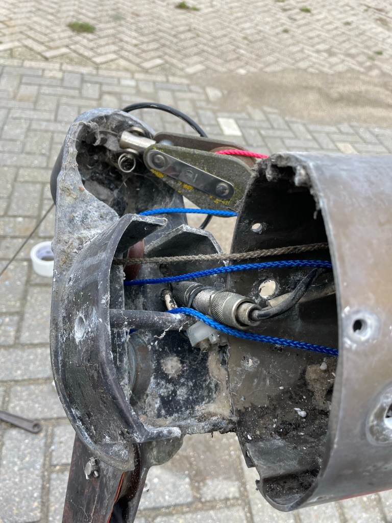 Op zaterdag moet ook de grootzeilval het ontgelden. Ik moet hiervoor wel de kop van de mast eraf halen. De grootzeilval bestaat namelijk voor de ene helft uit lijn en de andere helft uit staaldraad. En die wil er beide kanten op niet uit. Maar de aanhouder wint.