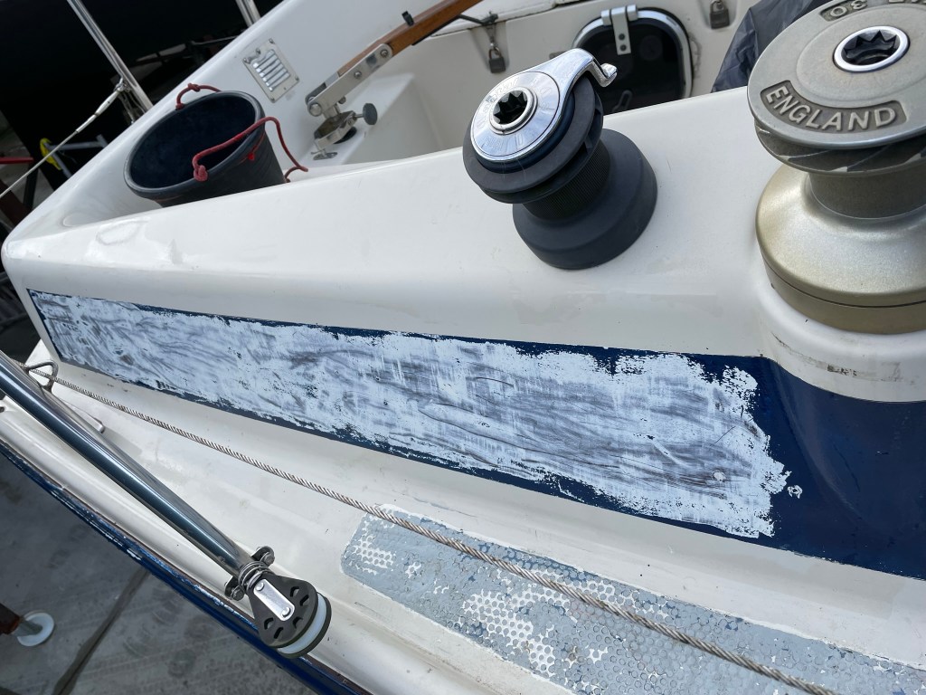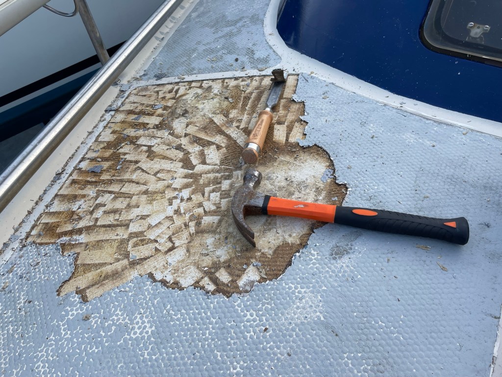Daarna wil ik toch even proberen hoe makkelijk de verf op de opbouw eraf gaat en of het antislip aan dek een beetje los wil laten. Ik smeer dus een stukje striping in met verf afbijt geschikt voor polyester en laat dit een half uur inwerken. Dan heb ik mooi de tijd om aan het dek te beginnen. Voor zit hier deels al een scheur in, dus een goede plek om te beginnen. Ik heb hiervoor een beetje rondgevraagd en gelezen hoe andere het hebben gedaan. Ik probeer eerst naar mijn idee de minst agressieve manier en de manier met de minste kans op nevenschade en dat is voorzichtig met een beitel en een hamer het los slaan. Dit gaat inderdaad. Het duurt wel even, maar de beschadigingen zijn gering. Ik besluit wel een bredere beitel te kopen en misschien ook eens te proberen het een beetje warm te maken en kijken of het dan beter loslaat. Maar dat is voor de volgende keer. Voor nu weet ik dat met wat geduld deze klus te klaren is.